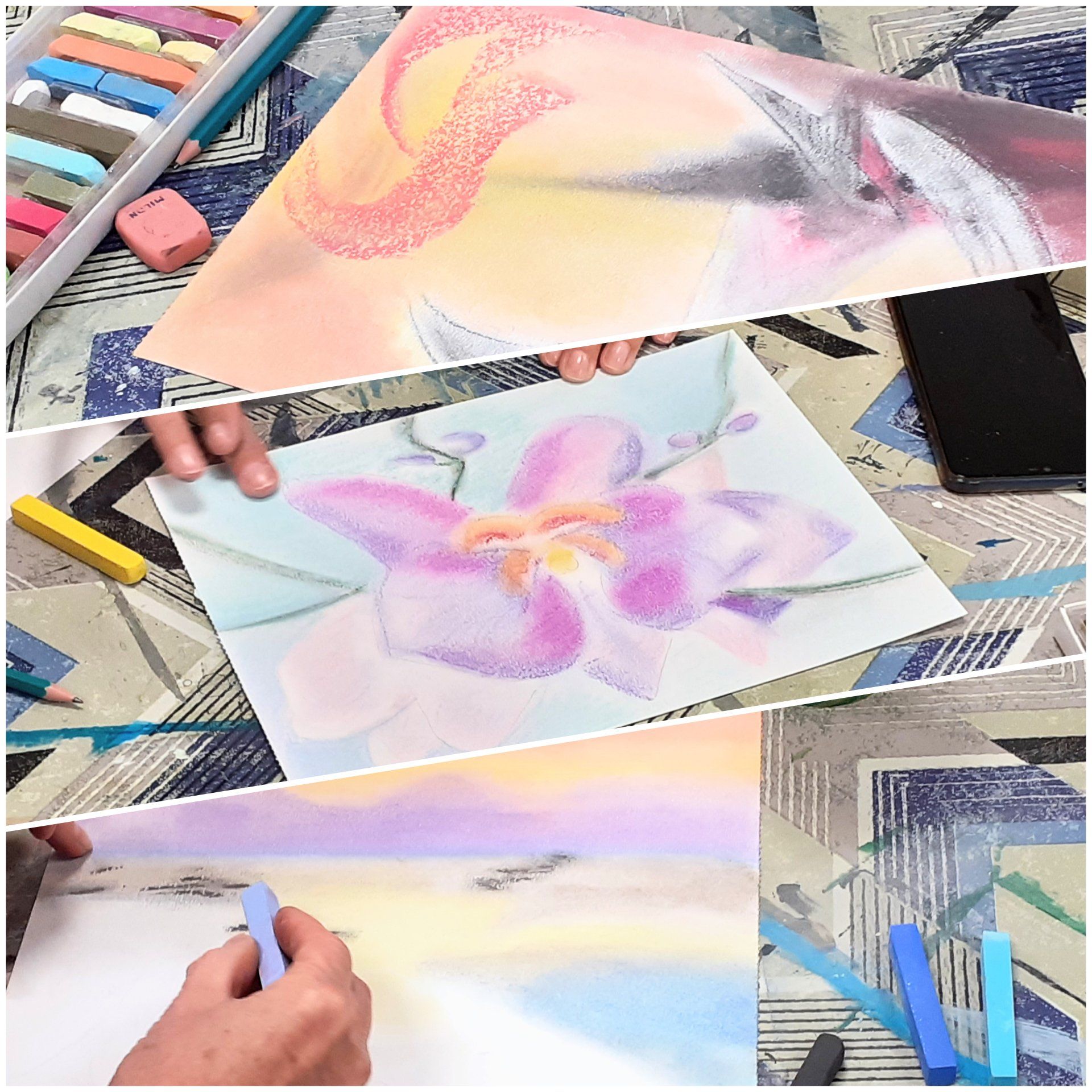 - pencil, charcoal, pastel, watercolor, acrylic
